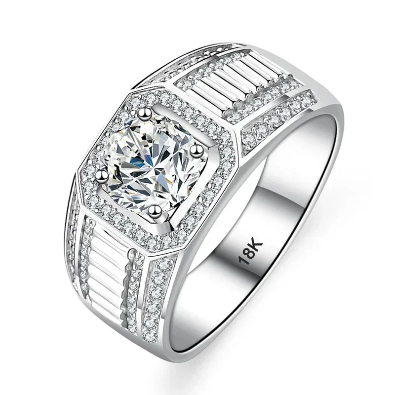 This beautiful 18K white gold ring is a perfect choice for a wedding band or engagement. It features a stunning moissanite main stone with a VVS1 clarity, giving it an exceptional sparkle that is indistinguishable from a high-quality diamond.