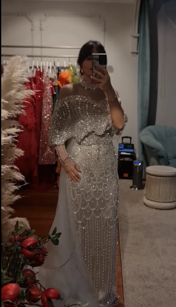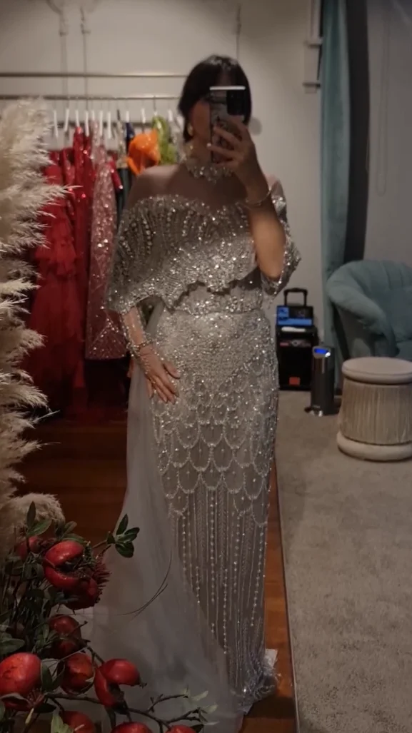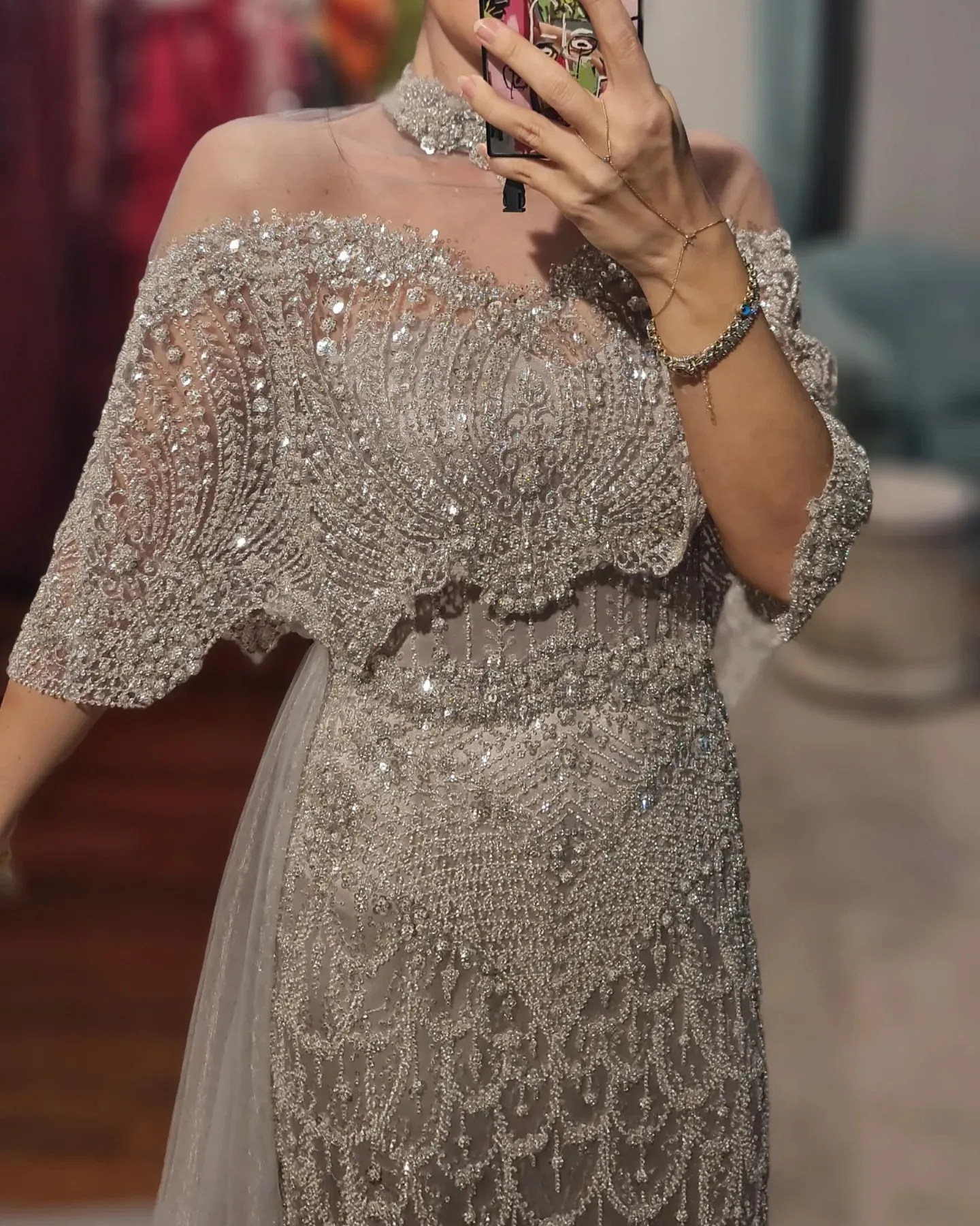 Make a grand entrance in this exquisite FATAPAESE evening gown, a perfect choice for any formal occasion. This breathtaking dress features a glamorous Trumpet / Mermaid silhouette that flows into a dramatic Chapel Train. The design is meticulously decorated with beads, crystals, embroidery, pearls, sequins, and intricate appliqués, creating a shimmering and opulent look from top to bottom. With its elegant O-neckline and built-in bra for support, this gown offers a flawless fit and a truly unforgettable style.