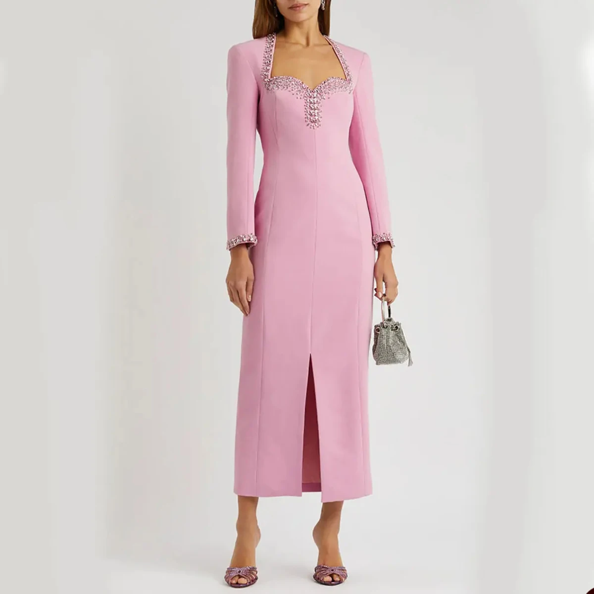 The stunning mermaid/trumpet silhouette provides a flattering fit, while the full-length sleeves and tea-length hem create a sophisticated and modern look. The dress is tastefully decorated with delicate beading and shimmering crystals, adding a touch of classic sparkle.