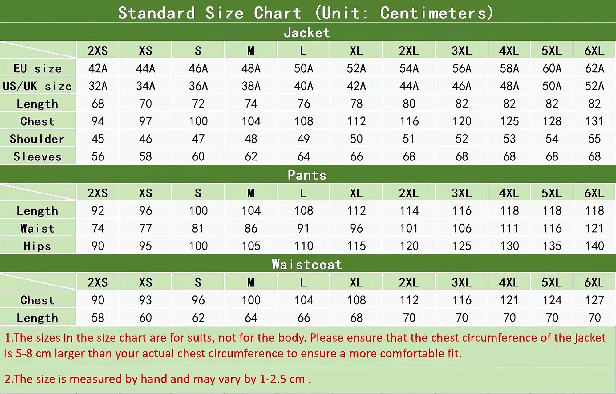 If you need a custom-made suit, please select "Custom" and leave us a message. The measurements we need are: chest circumference, abdomen circumference, shoulder width, and vest length. For the trousers, we need the waist circumference, hip circumference, length, and also your height and weight.